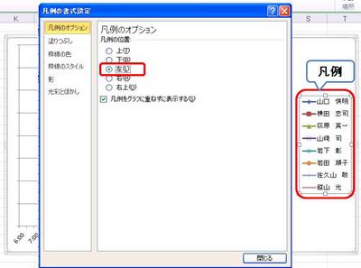凡例をダブルクリックして、「凡例の書式設定」で凡例の位置を「左」にして「閉じる」を押します。