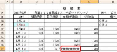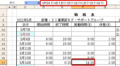 =E17-D17-G17・・・(終了時間-開始時間-休憩時間)