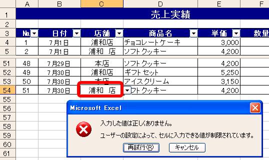 プルダウンリストが設定できました。リストに設定した店名以外は入力できません。
