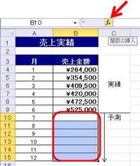 予測データを求めたい部分を範囲選択し、関数の挿入ボタンを押します。