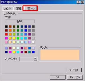 それぞれ上の画面で「書式」ボタンを押して、「パターン」タブを開き、