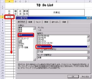 1.日付を入力します。 〇/〇のように表示されるように設定します。