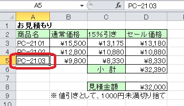 Excel でデータを入力して、Enterキーを押すと、下の図のように、