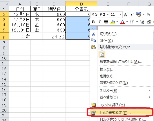 2.右クリックして、「セルの書式設定」を押します。