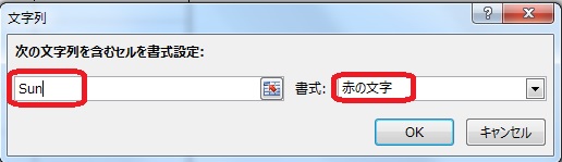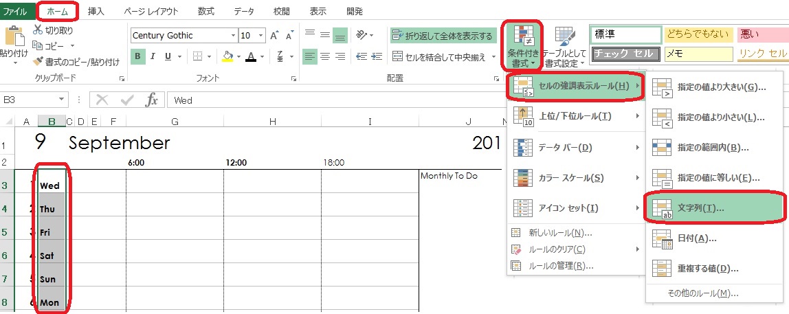 2.曜日を範囲選択して「ホーム」-「条件付き書式」-「セルの強調表示ルール」-「文字列」を押します。