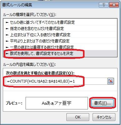 3.「数式を使用して、書式設定するセルを決定」を選び、関数式「COUNTIF(HOL!$A$2:$A$140,B3)=1」と入力して「書式」を押します。