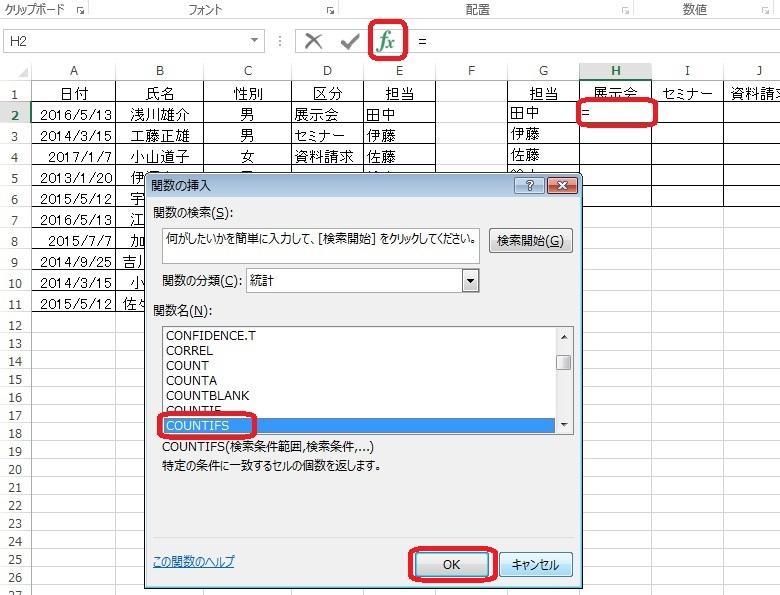関数の挿入「fx」を押し「COUNTIFS」を選び「OK」を押します。