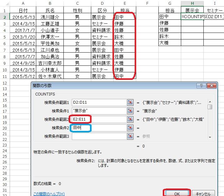 3.「検索条件範囲2」で、「担当」を範囲選択します。「検索条件2」「田中」と入力し「OK」を押します。