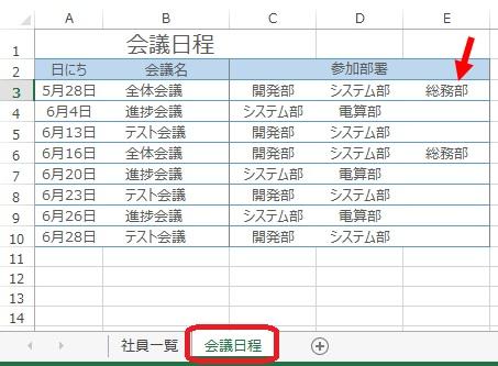 5.会議日程の表を変更します。図の矢印部分「総務部」を削除します。![]()