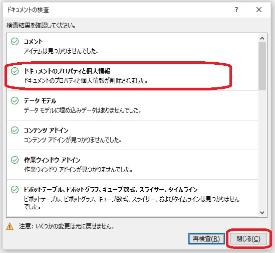 5.「!」マークと見つかった個人情報の項目が消えました。「閉じる」を押します。