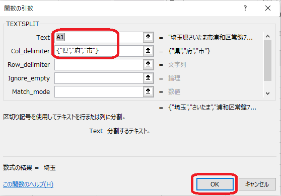 2.「TEXTSPLIT」を選択して「OK」を押します。