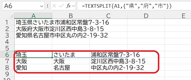 ※区切り文字(ここでは県、府、市)は、セルを分ける用の文字として使われてしまうので表示されなくなります。