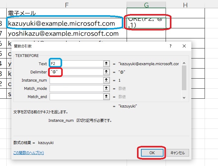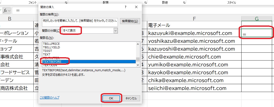 2.「すべて表示」ー関数名のボックスをクリックしてから「T」を押し、Tから始まる関数が出てくるので↓を押して「TEXTBEFORE」を選択して「OK」を押します。