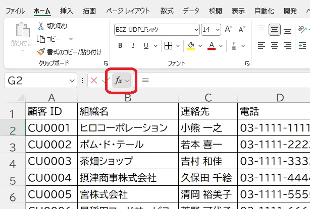1.関数式を入れるセルにカーソルを置いて「fx(関数の挿入ボタン)」を押します。