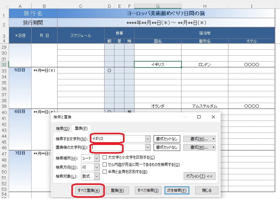 検索する文字列に「オランダ」、置換後の文字列に「イタリア」と入力し「すべて置換」を押します。