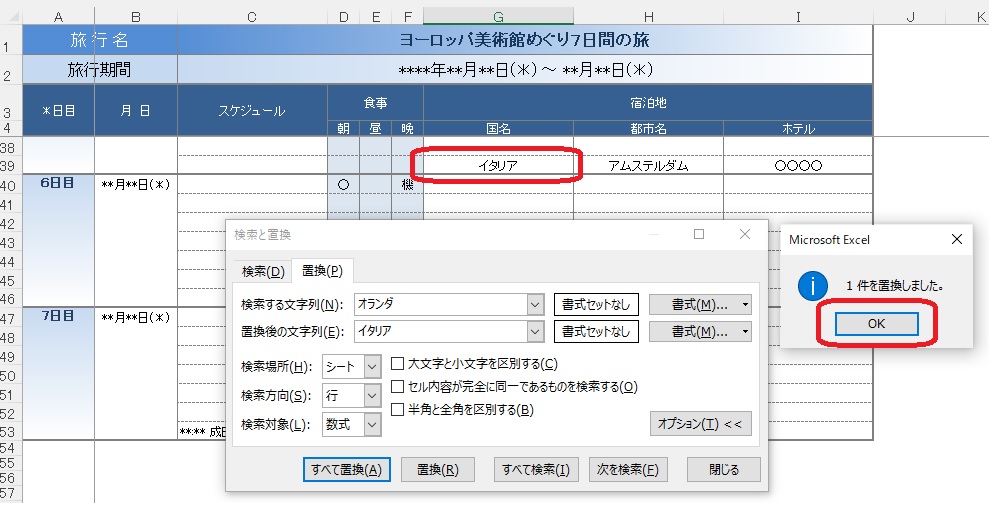 オランダがイタリアに変わりました。「1件置換しました」の「OK」を押します。