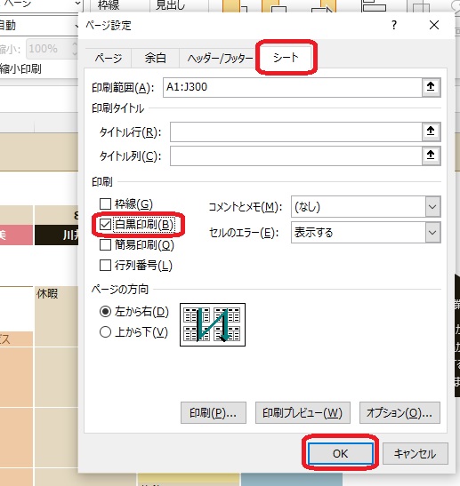 2.「シート」タブー「白黒印刷」にチェックを入れ「OK」を押します。