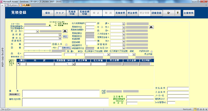 当社、管理本部では、dbSheetClient・Access版を導入し、営業担当者および営業アシスタントが利用する『営業支援システム』を構築しました。本システムは、日々、営業担当者が作成する見積書、注文書から請求書作成に至るまでを、カバーするMS-Accessのアプリケーションを国内10拠点でスムーズに運用できるシステムです。