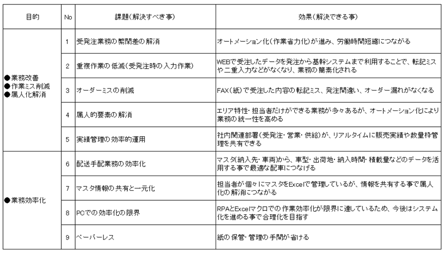 システム化にあたり、まず従来のExcel中心の受発注業務を可視化し、課題の整理と効果を明確にすることで、システム化の目的・ゴールを設定しました。(下記参照)